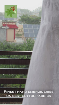 The most beautiful intricate Chikankari hand embroidery on handloom cotton fabric. The all over hand embroidery adds delicacy and beauty that belongs to the world of dreams! The style is unique and looks great on any body type and any occassion.